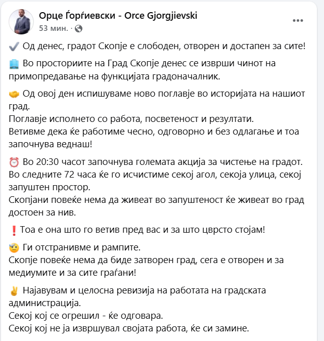 „Но, секој чесен, вреден и одговорен работник ќе биде награден и почитуван. Почитувани, време е да ставиме ред! Време е Скопје повторно да биде симбол на достоинство, ред и надеж. Скопје може подобро и тоа подобро, заедно го овозможуваме!“, додава градоначалникот.