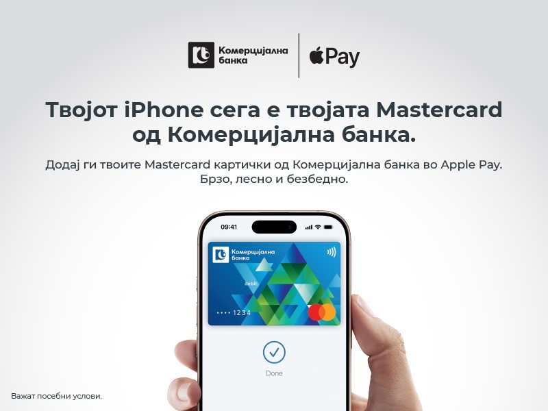 За да ги користиш бенефитите од Apple Pay, треба да ја преземеш бесплатната апликација Apple Wallet и да ги додадеш во неа твоите картички од Комерцијална банка. Постапката може да ја започнеш и преку апликацијата мБанка. Може да додадеш неограничен број картички, а потоа да бираш со која ќе плаќаш.