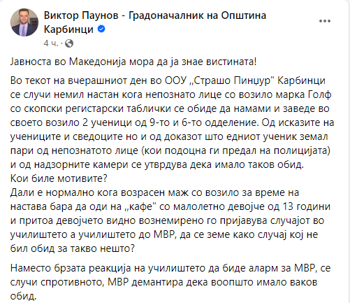 Вчера градоначалникот на Карбинци, Виктор Паунов алармираше дека во основно училиште во општината имало обид за киднапирање на деца, на што синоќа министерот за внатрешни работи, Оливер Спасовски кажа дека се работи за собирање на политички поени на мртви души.