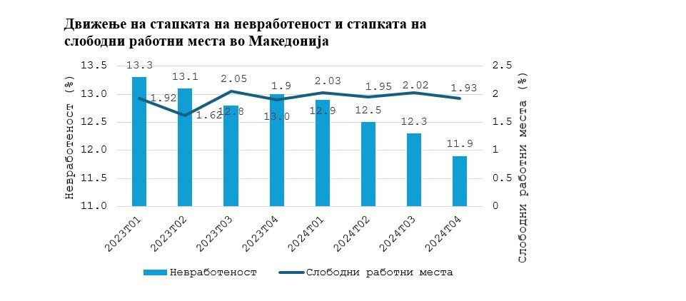 Покрај надолниот тренд на стапката на невработеност, стапката на слободни работни места на македонскиот пазар на труд во периодот 2020-2024 година останува стабилна поставена на ниво околу 2%. Имено во четвртото тримесечје од 2024 година стапката на слободни работни места изнесува 1.92%, односно 9 562 слободни работни места. Оттука, може да се констатира дека македонскиот пазар на труд се соочува со паралелно намалување на стапката на невработеност, стагнација на нивото на вработеност и пораст на слободните работни места. Оттука, покрај тоа што на македонскиот пазар на труд повеќе од 97500 работници согласно своите квалификации, компетенции и ниво на образование не се во состојба да пополнат скоро 9500 работни места, односно во ситуација каде што соодносот на работниците кои бараат работа и слободни работни места се движи скоро 10 спрема 1, македонскиот пазар на труд не може да ги алоцира работниците на соодветните работни места.