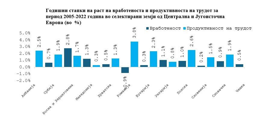 Оттука, може да се констатира дека пазарот на труд во Македонија покрај претпоставката дека функционира како една целина, истиот бележи значителна сегментираност,како во поглед на нивото на невработеност и вработеност, така и во поглед на стапката на партиципација на работната сила и недоволниот раст на продуктивноста на трудот. Имено, доколку се направи компарација на просечните годишни стапки на раст на вработеноста и продуктивноста на трудот во периодот 2005-2022 година, може да се заклучи дека вработеноста во Македонија во анализираниот период бележи константен тренд на пораст од една страна, додека пак продуктивноста на трудот се карактеризира со стагнација, дури и бележи намалување во одделни сектори, што упатува на фактот дека македонскиот пазар на труд продуцира непродуктивни вработувања. Дополнително, во периодот 2019-2024 стапката на вработеност во Македонија стагнира на ниво околу 45-46%, што воедно е и помеѓу најниските стапки на вработеност во земјите од Централна и Југоисточна Европа.