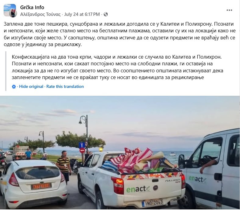 Туристите во обид да си зачуваат убаво место во првиот ред покрај морето, останаа без своите реквизити, откако инспекторите ги собраа. Она што е најинтересно е што не ги враќаат, туку ги носат на депонија, каде истите ќе бидат рециклирани.