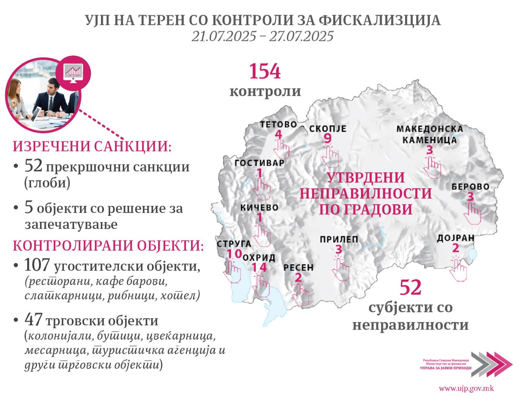 Над педесет компании добија прекршочни санкции, додека пет компании се затворени бидејќи по втор пат во период од две години се фатени дека не издаваат фискални сметки. Ова го соопштуваат од Управата за јавни приходи од каде посочуваат дека во период од 21 до 27 јули 2025 година спроведени се вкупно 154 теренски контроли за фискализација.