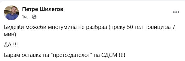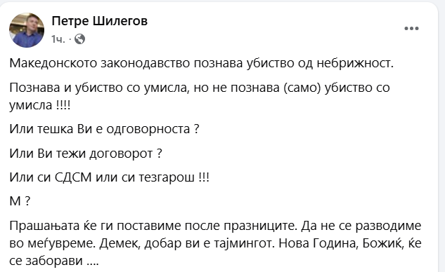 „Македонското законодавство познава убиство од небрижност. Познава и убиство со умисла, но не познава (само)убиство со умисла!!! Или тешка Ви е одговорноста ? Или Ви тежи договорот? Или си СДСМ или си тезгарош!!! М? Прашањата ќе ги поставиме после празниците. Да не се разводиме во меѓувреме. Демек, добар ви е тајмингот. Нова Година, Божиќ, ќе се заборави…” Да!!! Барам оставка на ‘претседателот’ на СДСМ!“, пишува Шилегов.