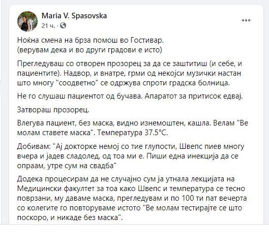 Додека процесирам да не случајно сум ја утнала лекцијата на Медицински факултет за тоа како Швепс и температура се тесно поврзани, му даваме маска, прегледувам и по 100 ти пат вечерта со колегите го повторуваме истото "Ве молам тестирајте се што поскоро, и никаде без маска".