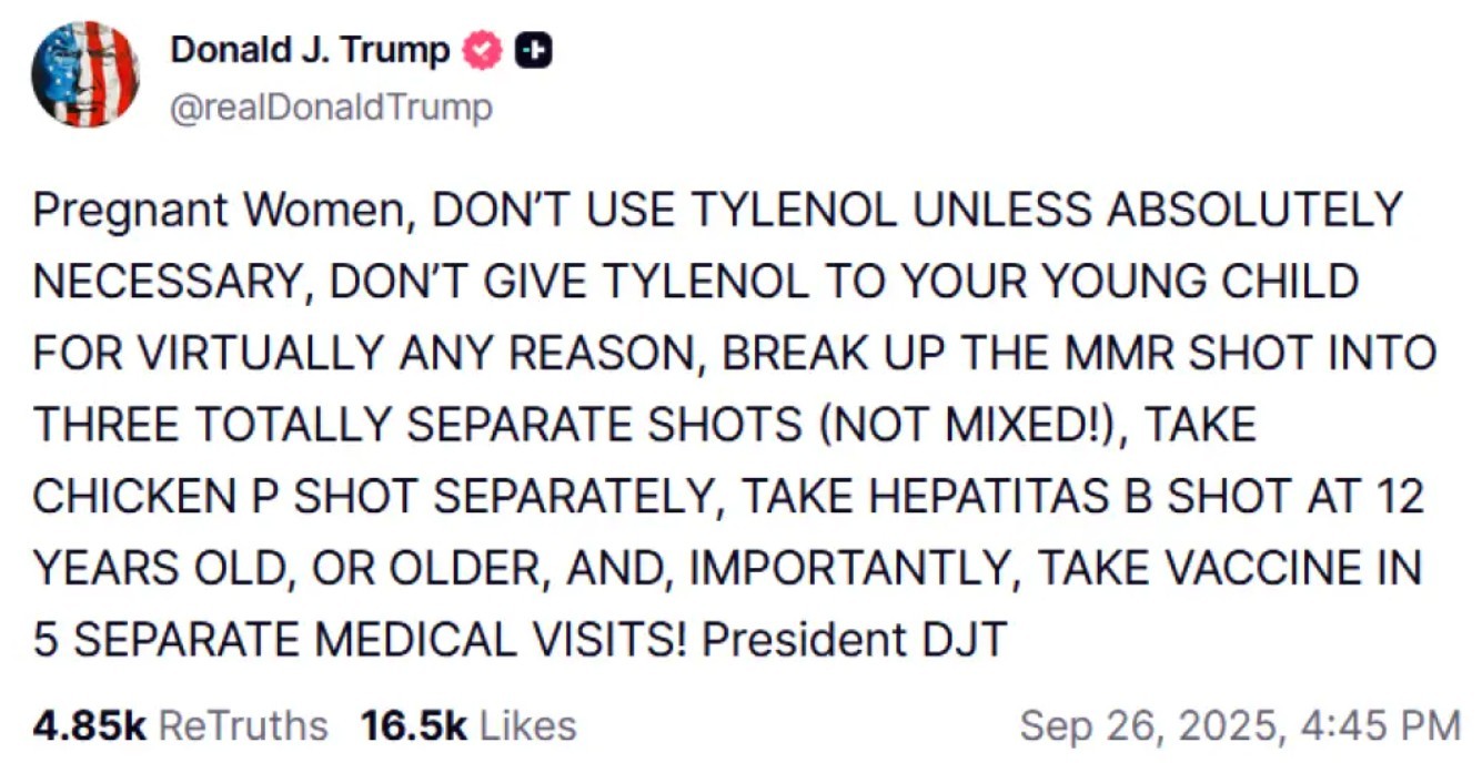„Бремени жени, не користете „таленол“ освен ако не е апсолутно потребно, не давајте „таленол“ на вашето мало дете туку-така без никаква причина, поделете ја МРП вакцината (против морбили, заразни заушки и рубеола, н.з.) на три посебни вакцини, на три одделни дози (не сите заедно во една вакцина), земете ја вакцината против овчи сипаници одделно, против хепатитис Б после 12 годишна возраст и најважно, примете ги вакцините во пет посебни посети на медицинскиот тим.“ Ова го напиша американскиот претседател Доналд Трамп на неговата социјална мрежа, Truth social.