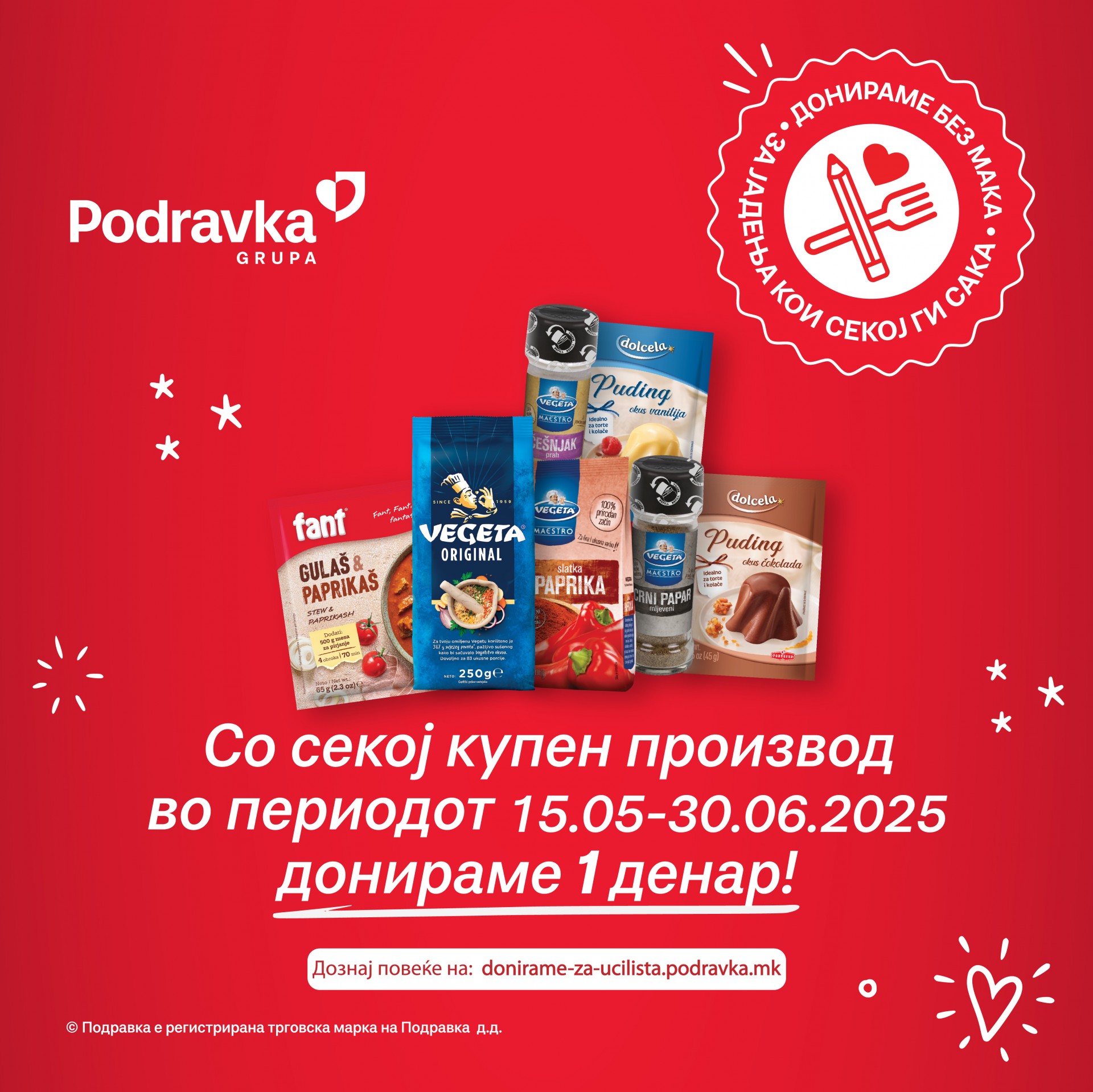 Проектот „Донираме за училишта без мака и за јадења што секој ги сака!“е продолжение на иницијативата на Подравка Групацијатаод 2023 година, кога беа донирани средства за угостителското училиште од продажбата на селектирани производи под брендот Вегета.