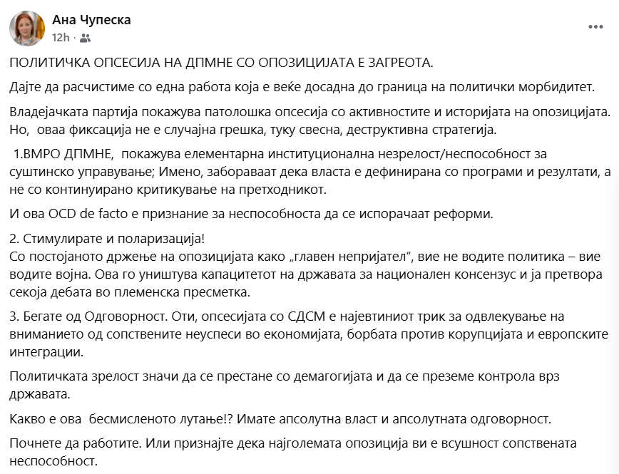 „ПОЛИТИЧКА ОПСЕСИЈА НА ДПМНЕ СО ОПОЗИЦИЈАТА Е ЗА ГРЕОТА“: Чупеска вели власта има патолошка опсесија со СДСМ