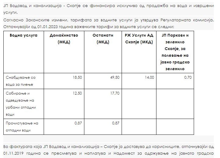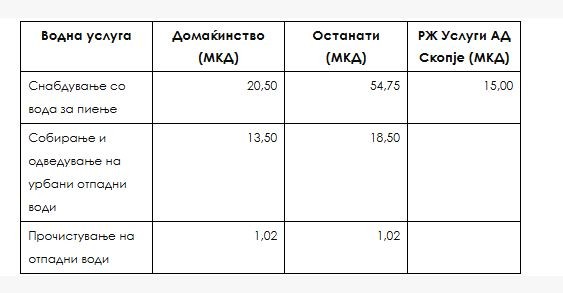 Цената на водата за пиење за домаќинства е зголемена од 18,5 денари на 20,5 денари по метар кубен. Кај категоријата домаќинства е зголемена и цената на услугата за собирање и одведување на урбани отпадни води од 12,5 на 13,5 денари по метар кубен вода.