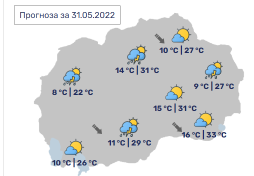 Метеоролозите предвидуваат сончево и умерено облачно време со температури кои ќе достигнат максимални 29 степени Целзиусови во Скопје, 20 во Тетово и Гостивар, 31 во Гевгелија, и 30 во централниот регион, додека во Истокот температурите ќе се искачат до максимални 25 степени.
