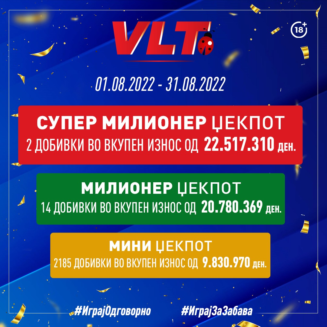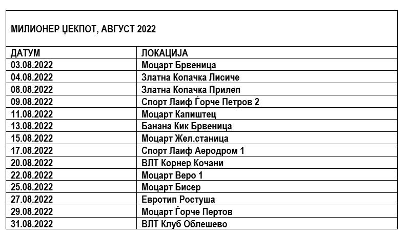 Овој месец двапати донесовме радост со најголемата добивка на овие простори, најпосакуваниот СУПЕР МИЛИОНЕР ЏЕК ПОТ. Првиот беше празничниот на 08.08.2022 вреден 10.856.426,00 денари, освоен во СЛ КЛУБ Гостивар. Вториот СУПЕР МИЛИОНЕР вреден 11.660.884,00 денари го освои играч во Моцарт Кочани на 23.08.2022.