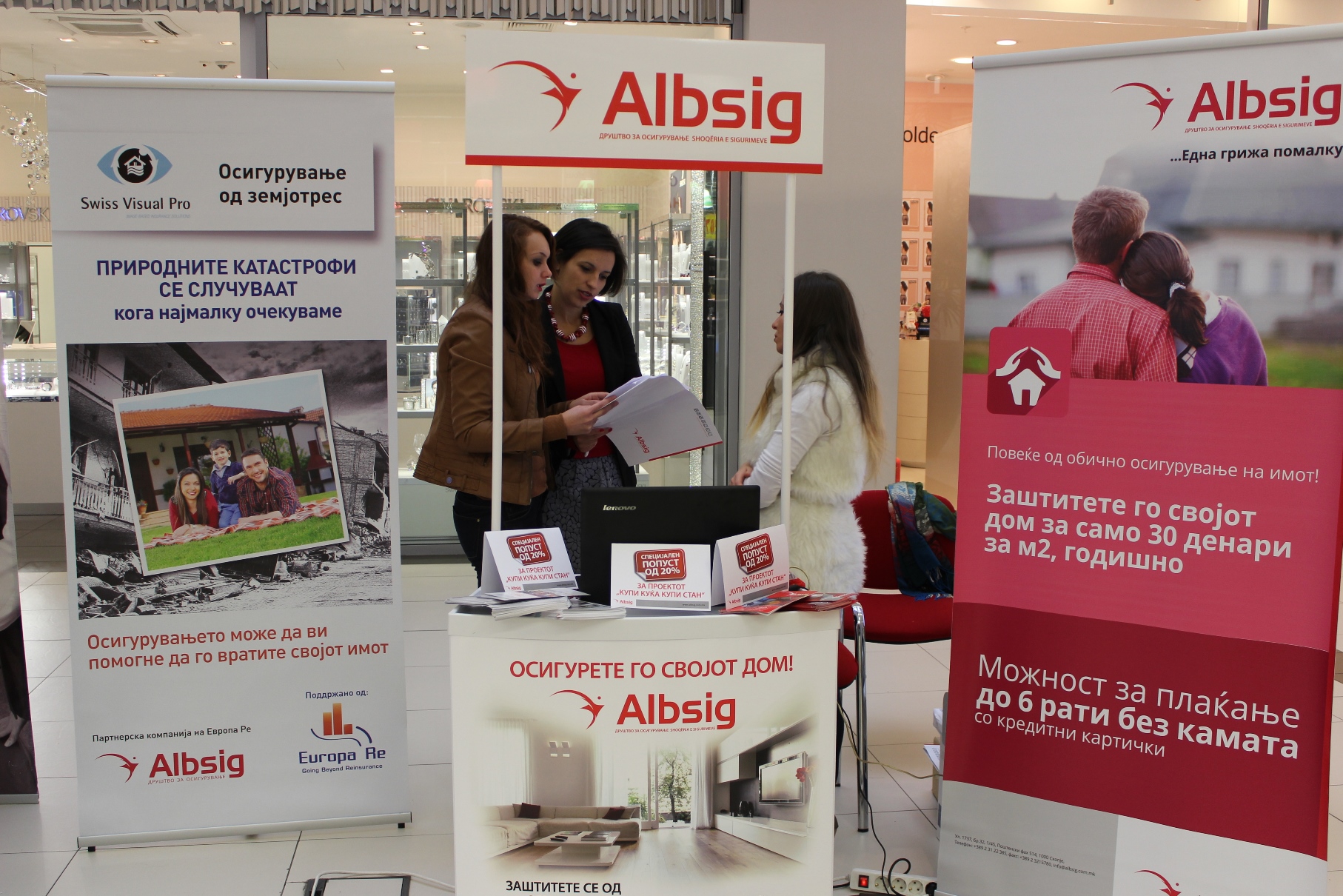На промотивниот штанд, посетителите на саемот можат да ги добијат сите неопходни информации за првото сеопфатно осигурување од земјотрес (Swiss Visual Pro) на пазарот во Македонија, како дел од програмата на Европа Ре, и за осигурувањето на домаќинства, продукти кои Албсиг ги нуди по поволни цени, прилагодени за проектот „Купи куќа, купи стан“.