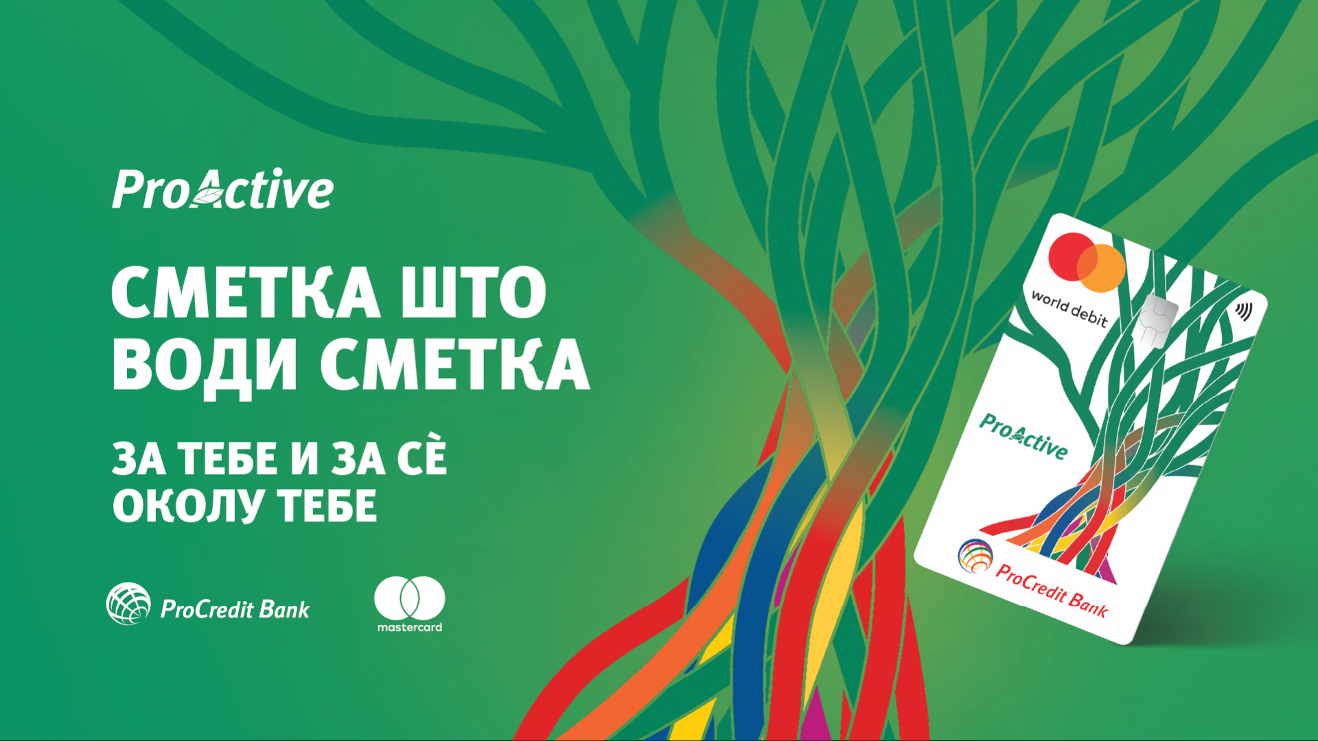 Неодамна ПроКредит Банка ја лансираше новата, уникатна банкарска услуга за физички лица - ProActive сметка што носи многу поволности за корисниците, меѓу кои е и одговорноопштествено влијание. Од банката велат дека ова решение е креирано за поединци кои сакаат нивните секојдневни финансиски одлуки да имаат поголемо значење.