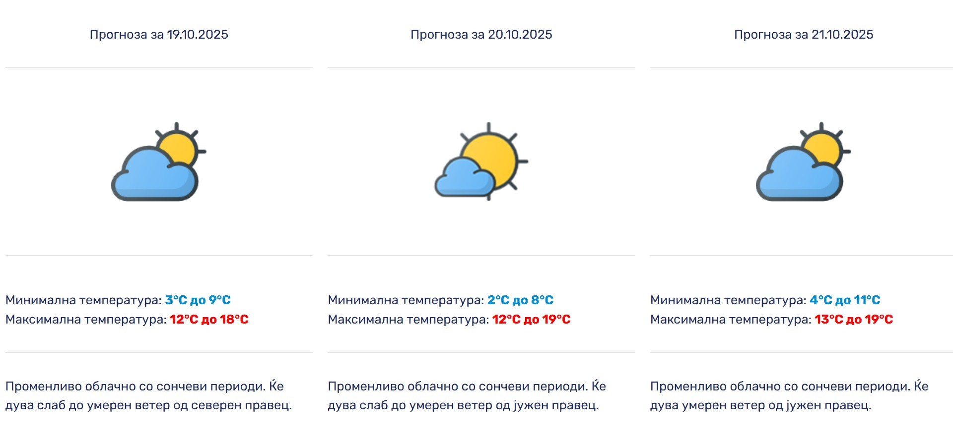 Утринските температури ќе се движат од 4 до 10 степени, додека максималните дневни температури се очекува да достигнат од 10 до 19 степени.