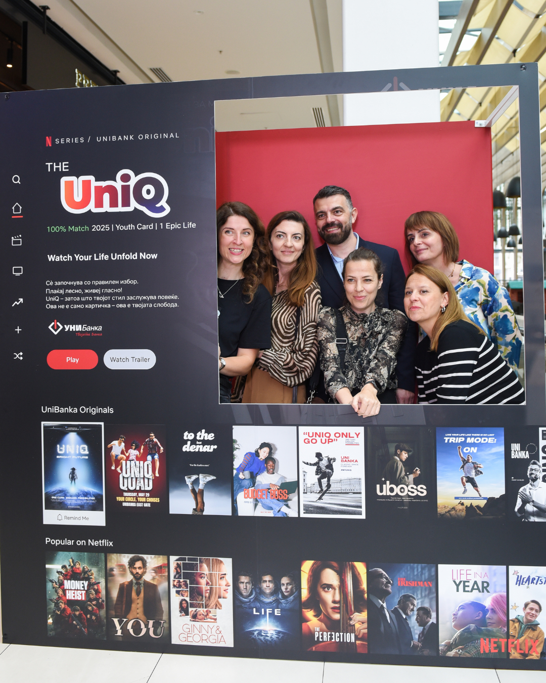 Промоцијата се одвиваше во динамична и пријателска атмосфера, со диџеј сет од DJ Babura Junior и фото-зона инспирирана од NETFLIX, каде што можеше да се направат уникатни фотографии. А во знак на благодарност, УНИБанка на своите гости подели и тематски подароци.