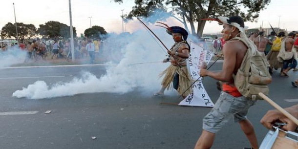 Бразилската полиција фрли солзавец на околу 500 домородци - индијанци кои ги стрелале со стрели, и уште околу 500 претставници на разни социјлани групи кои вчера протестираа против одржувањето на Светското првенство во Бразил, осудувајќи го прекумерното трошење на пари.