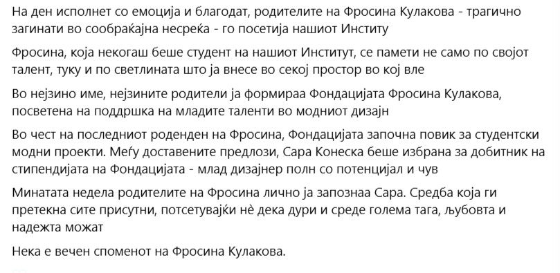 Првата стипендистка на Фондацијата „Фросина Кулакова“ е Сара Конеска. Информацијата на социјалните мрежи ја објави сестрата на Фросина Кулакова, Росица.