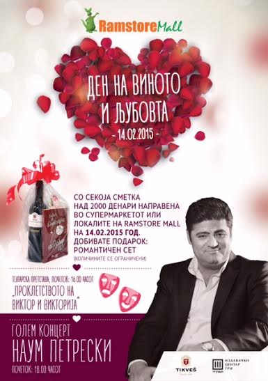 На 14.02 сите случувања во Рамстор Мол ќе бидат посветени во славање на љубовтаи виното. Богатата програма започнува во 16.00 часот со изведба на театарската претстава „Проклетството на Виктор и Викторија“,, според сценарио и режија на Војо Цветановски, а ќе продолжи во 18.00 со концерт на македонската фолк ѕвезда Наум Петрески.