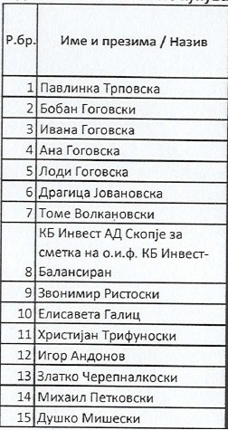Како што објави ТТК Банка, нови сопственици на корпоративните обврзници се Павлинка Трповска, Бобан Гоговски, Ивана Гоговска, Лоди Гоговска, Драгица Јовановска, Томе Волкановски, КБ Инвест АД Скопје Звонимир Ристоски, Елисавета Галиц, Христијан Трифуноски, Игор Андонов, Златко Черепналкоски, Михаил Петковски и Душко Мишески.