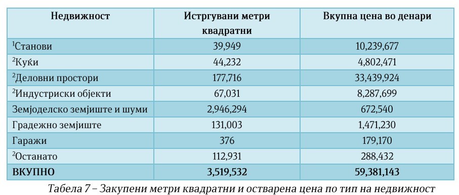 Во вториот квартал се закупени недвижнини со површина од 3.519.532 метри квадратни со вкупна месечна закупнина од 59.381.143 денари.