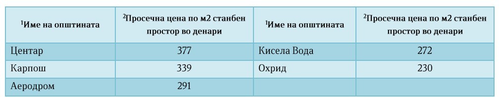 Податоците на Катастар покажуваат дека највисока цена за закуп на станбен простор има во општина Центар во Скопје, каде таа изнесувала 377 денари за метар квадратен, па следува Карпош со 339 денари за метар квадратен.