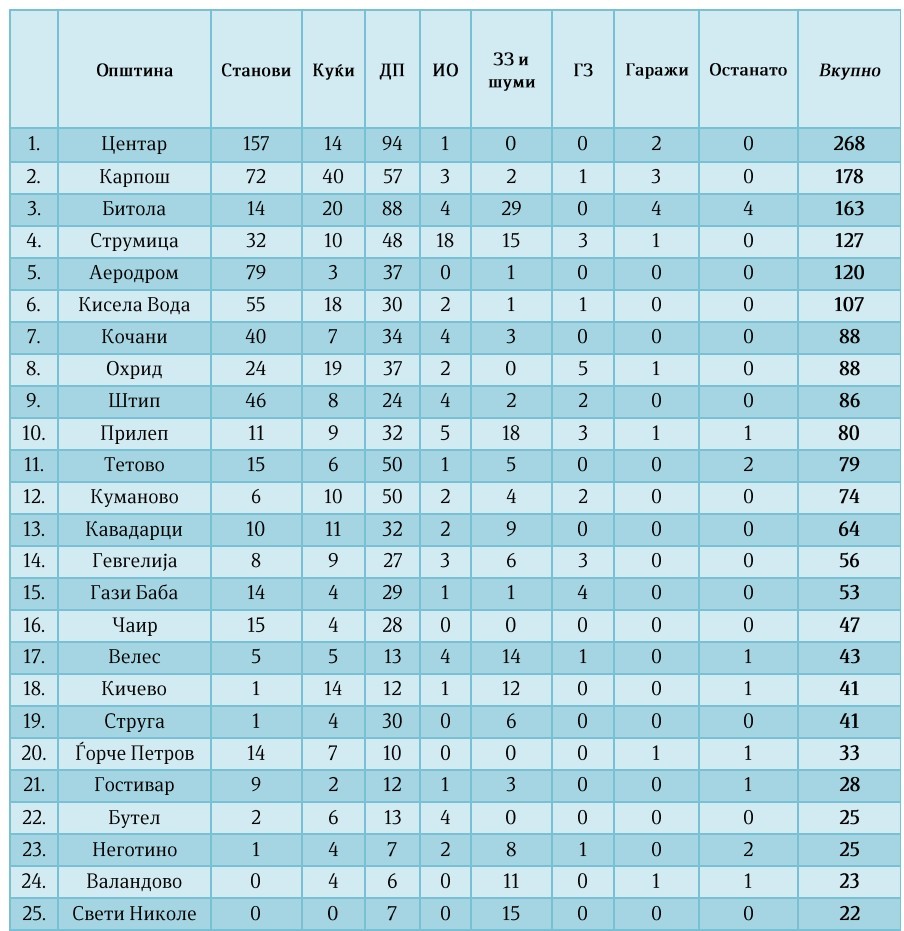 Најголем интерес и најголем број на издадени станови и останати недвижнини има во Скопје, поточно во општина Центар, па следува Карпош, па Битола. Малку зад нив се Струмица и општина Аеродром, па Кисела Вода.