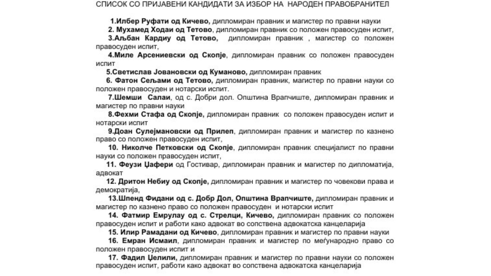 Собранието ги објави имињата на сите 17 кандидати за Народен правобранител, кои аплицираа за позицијата откако доскорешниот, Насер Зибери замина во пензија. За негов наследник аспирации имаат повеќемина, меѓу кои раководител на Одделение за поддршка на Советот на Општина Куманово, Фехми Стафа, државниот правобранител кој беше разрешен, правник кој завршил студии во Меѓународниот универзитет во Струга, кој беше во сопственост на синот на струшкиот градоначалник, Рамиз Мерко, член на комисијата за помилување кај претседателката Сиљановска, како и поранешниот член на антикорупциската комисија, Шемси Салаи.