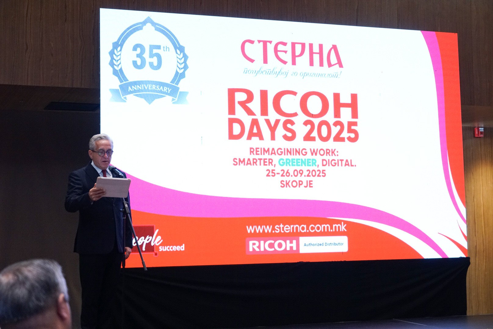 На 25.9.2025 во Hotel Marriott Skopje се одржа Ricoh Days Skopje 2025, конференција што ги обедини дигиталната трансформација, иновациите и одбележувањето на голем јубилеј – 35 години од основањето на СТЕРНА ДОО, официјален дистрибутер на Ricoh за Македонија.