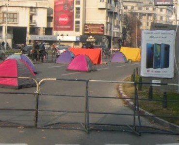 Движењето со автомобили е отежнато за време на првото работно утро денеска, откако во саботата попладне пред македонското Собрание движењето „Македонија блокира“ постави мини-шатори по протестот, а истите ќе останат пред законодавниот дом до Нова Година.