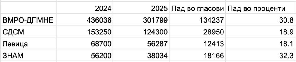 „Споредбените анализи со изборните резултати од минатата година покажуваат дека ВМРО–ДПМНЕ и ЗНАМ имаат изгубено по речиси една третина од гласовите. Падот на ВМРО-ДПМНЕ е фантастични 135.000 или 30,8% од гласовите, а ЗНАМ паѓа од 56.200 на 38.034 гласови, односно е најголем губитник и има изгубено 33% од гласовите“, велат од СДСМ.