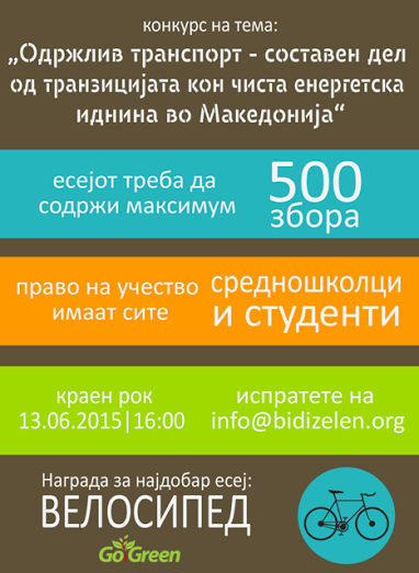 Младинската еколошка организација Гоу Грин распишува конкурс за изработка на најдобар есеј на тема: „Одржлив транспорт - составен дел од транзицијата кон чиста енергетска иднина во Македонија“.
