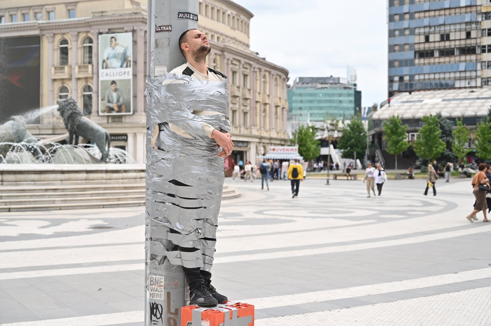 СЕ ЗАЛЕПИ СО СЕЛОТЕЈП НА БАНДЕРА НА ПЛОШТАДОТ ВО СКОПЈЕ И ИСПРАТИ СИЛНА ПОРАКА: „Во Кочани се вратија деца со ампутирани прсти, мене ми загинаа петмина другари“