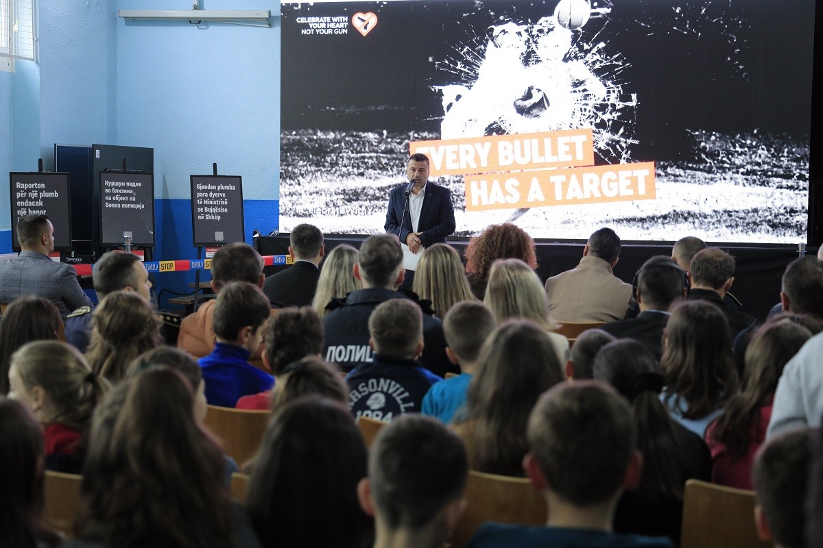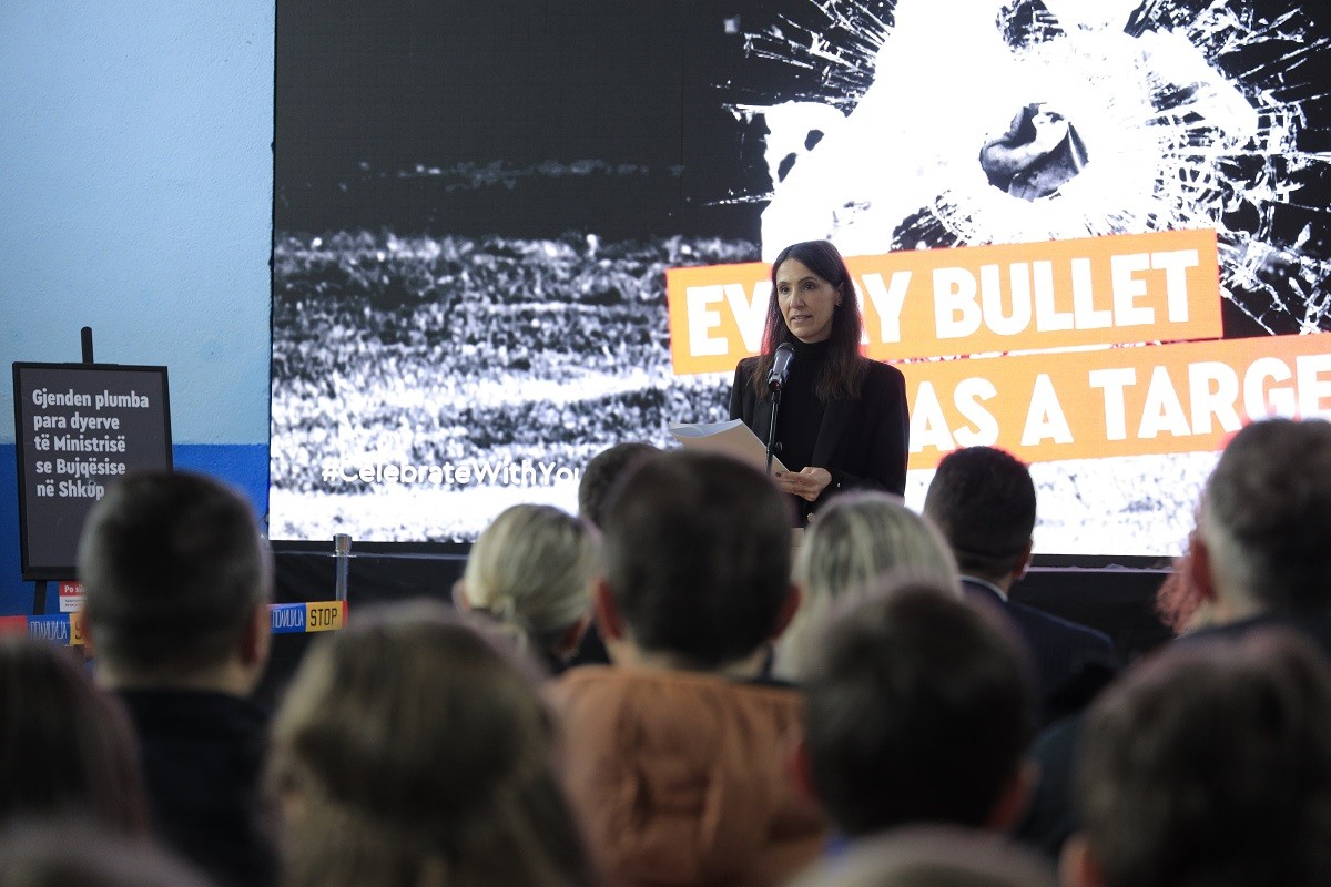 „Доколку некој сега излезе од оваа сала и пука во воздух, тој куршум за период од 20 до 90 секунди ќе падне на земјата, се разбира во зависност од аголот на пукање. Тоа оловно зрно може да заврши тука во непосредна близина, но и дури три километри подалеку од местото на пукање, во соседното село. Секој испукан кушрум има мета, а таа мета може да биде некое дете кое се враќа од училиште, нечија сестра, нечиј брат, сопруг или сопруга. Затоа, пораката која сакам да ја пренесам денеска е дека секој од нас може да придонесе и да спречи трагедија доколку одбие да биде сведок и дел од прослави каде што се слави со огнено оружје и се пука“, порача заменичката на постојаниот претставник на УНДП, Сања Бојаниќ.