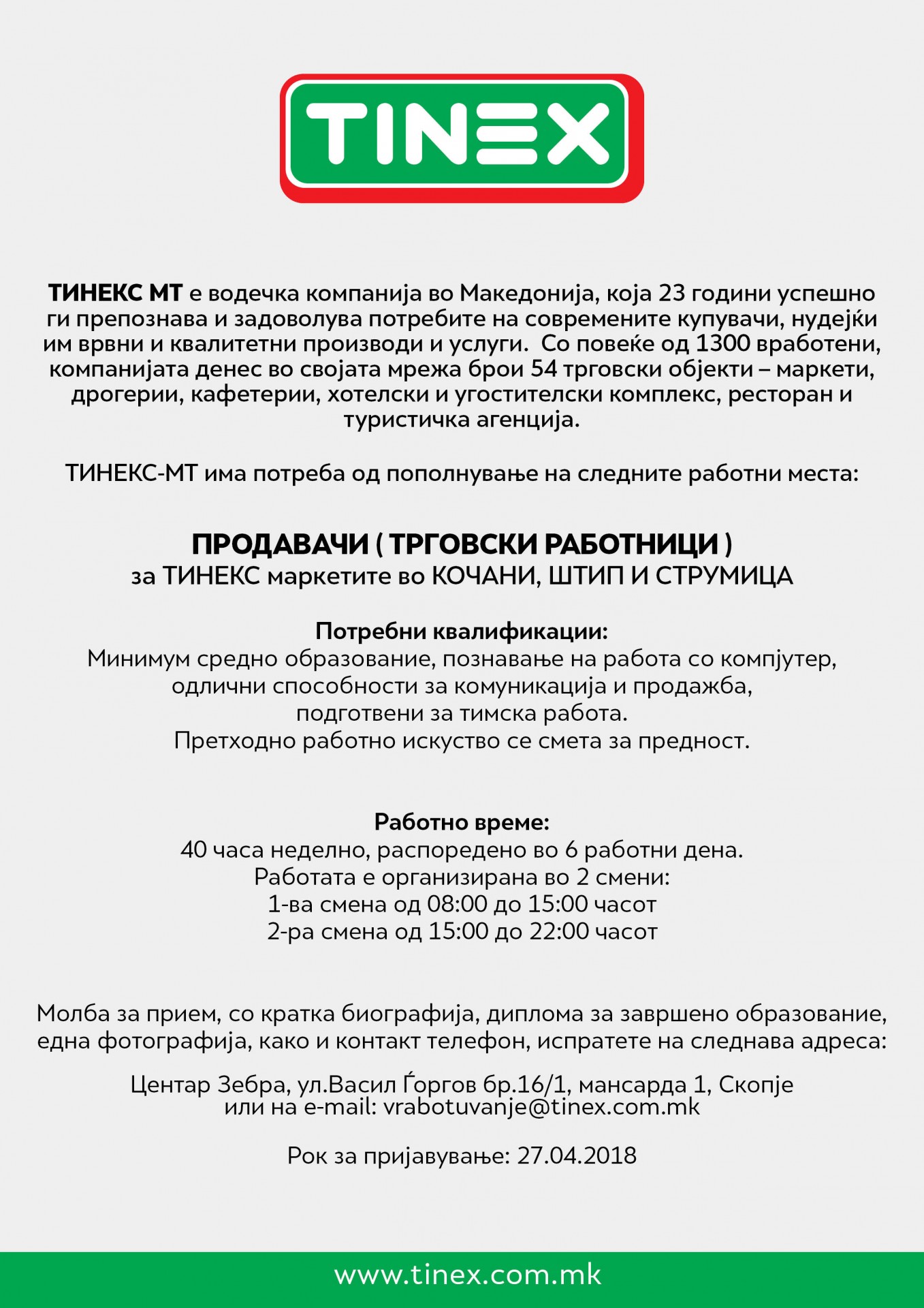 ШАНСА ЗА ВРАБОТУВАЊЕ: Отворени работни места во Тинекс и Алкалоид