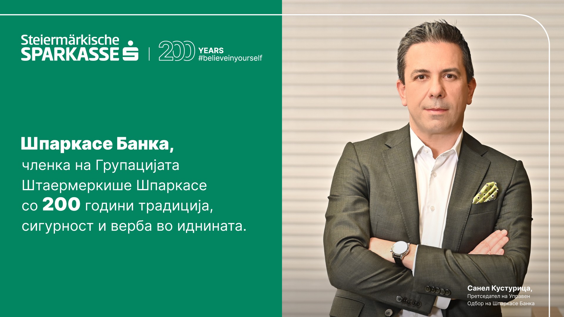 - „Во 2025 година славиме 200 години постоење, историја и визија. Горди сме што Шпаркасе Банка АД Скопје е дел од банкарска групација Штаермеркише Шпаркасесо полни два века искуство, а истовремено предводник на новите генерации клиенти и вработени, кои гледаат кон иднината со сигурност и оптимизам. Нашата улога не е само финансиска, без разлика дали се млади корисници, мали бизниси или големи корпорации – ние сме присутни таму каде што навистина значи. Веруваме во долгорочни односи, па затоа нашата мисија останува иста, со нашите клиенти да бидеме партнер од доверба, кој ги разбира потребите на луѓето и активно придонесува кон развојот на заедницата“ – изјави г. Санел Кустурица, претседател на Управниот одбор на Шпаркасе Банка АД Скопје.