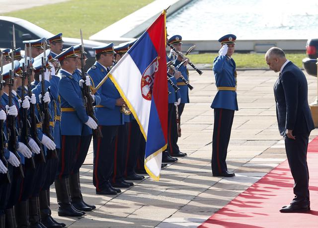 Во Србија тој беше пречекан со државнички почести, но со засилено обезбедување, со оглед на тоа што посетата се случува во чувствителен момент на заладени односи меѓу двете држави, особено по последните инциденти на фубалскиот натпревар Србија-Албанија.