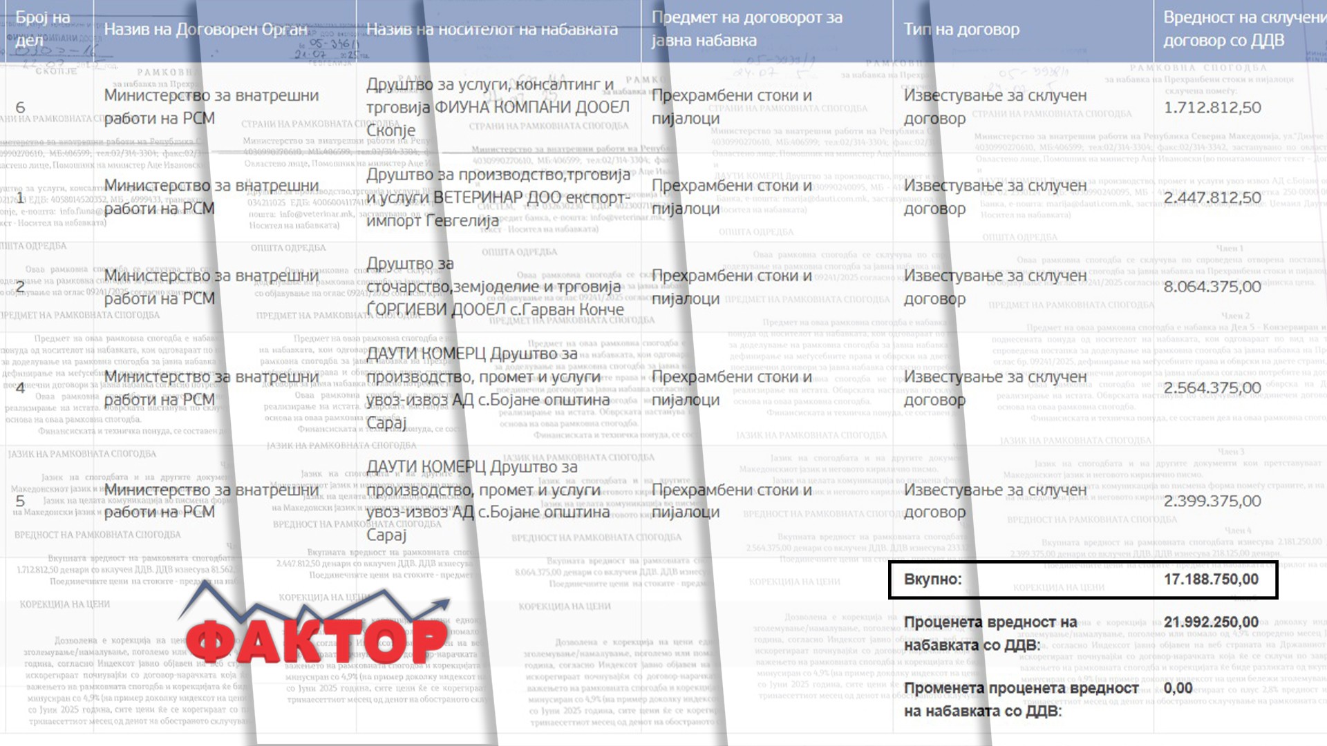 Министерството за внатрешни работи потпиша рамковни спогодби од речиси 280 илјади евра со пет фирми, а за храна која за во бифе на МВР Скопје, одмаралиштата на МВР во Крани, Пониква и Охрид и по потреба Крушево и Струмица.