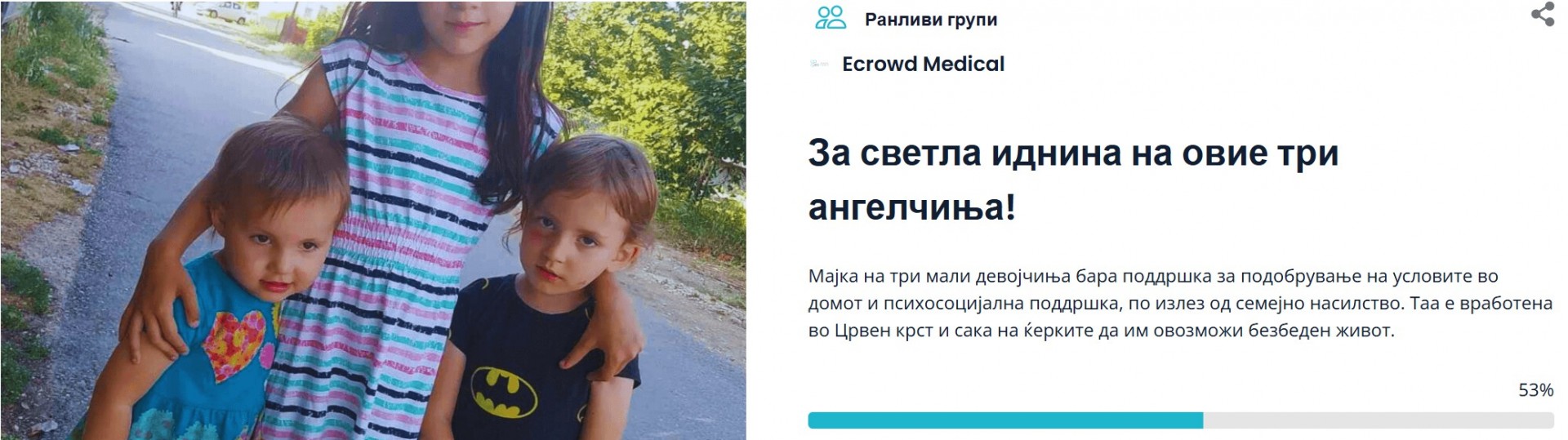 На веб страната „еCrowd“ се споделува објава за помош за три мали девојчиња чија мајка бара поддршка за подобрување на условите во домот и психосоцијална поддршка, по излез од семејно насилство. Таа е вработена во Црвен крст и сака на ќерките да им овозможи безбеден живот.