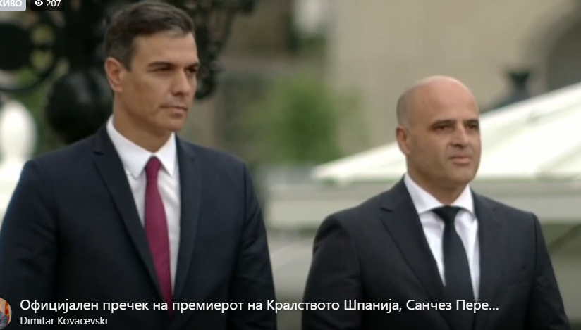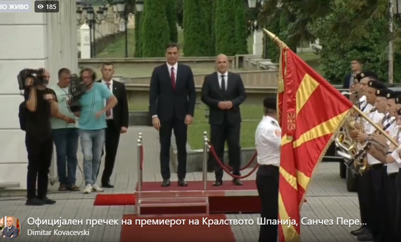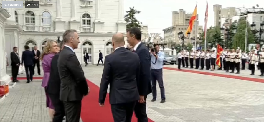Премиерот Педро Санчез е свечено пречекан од премиерот Ковачевски, пред Влада, со интонирање на двете химни.