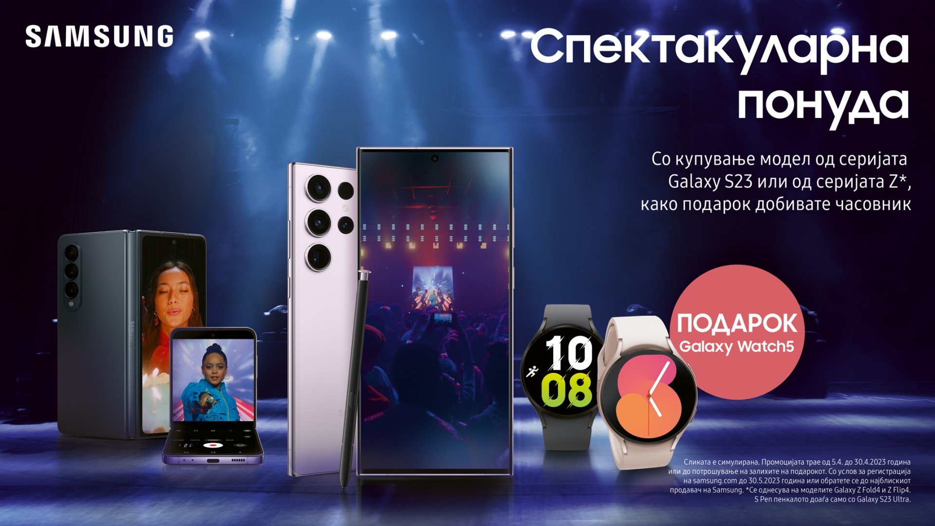 Samsung подготви специјална понудаво која корисниците кои ќе купат смартфони од серијата Galaxy S23[1] или Z[2] добиваат на подарок паметен часовник Samsung Galaxy Watch544 мм во графитна боја или Samsung Galaxy Watch5 40мм ворозово - златна боја. Промоцијата трае од 5 април 2023 година. до 30 април 2023 година. или додека не се потроши залихата за подароци.