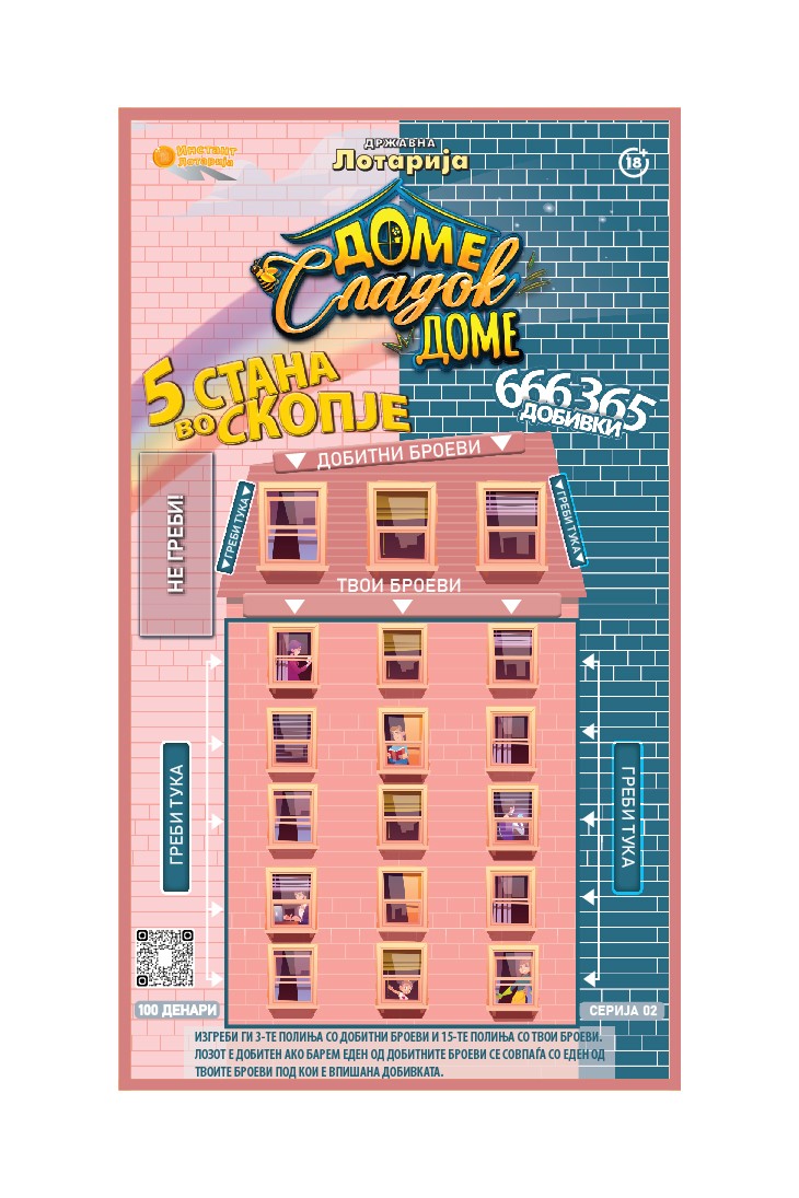 Секој нов дом почнува со еден сладок сон, а понекогаш и со само еден лоз. Државна лотарија со гордост го претставува инстант лозот „Доме, сладок доме“, кој нуди шанси за парични добивки и можност да се оствари еден од најголемите животни соништа – сопствен дом во Скопје.