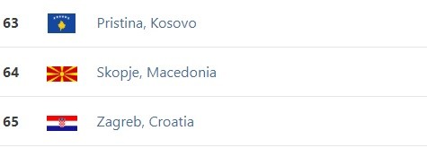 На 63 место е Приштина, а на 65 е Загреб.