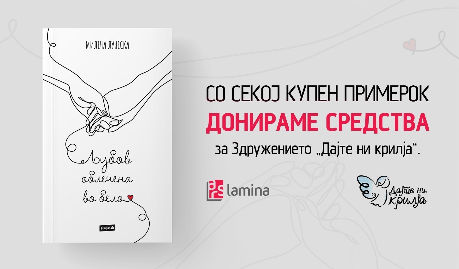 Авторката Милена Лунеска и издавачката куќа „Арс Ламина“ ќе донираат средства од продажбата на стихозбирката „Љубов облечена во бело“ за невладината организација „Дајте ни крилја“. Со секој купен примерок од книгата, дел од заработката ќе биде наменет за поддршка на Здружението на граѓани за лица со дисфункции, хендикеп, ретки болести и посебни потреби – „Дајте ни крилја“, чиј почесен претседател е поп-пејачката Ребека Јанковска-Ристески.