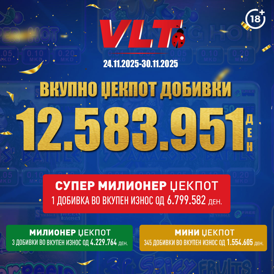 Од 24.11.2025 до 30.11.2025 Видеолотарија Касинос Австрија исплати фантастични 12.583.951 денари кон играчите на ВЛТ терминалите ширум Македонија и тоа: