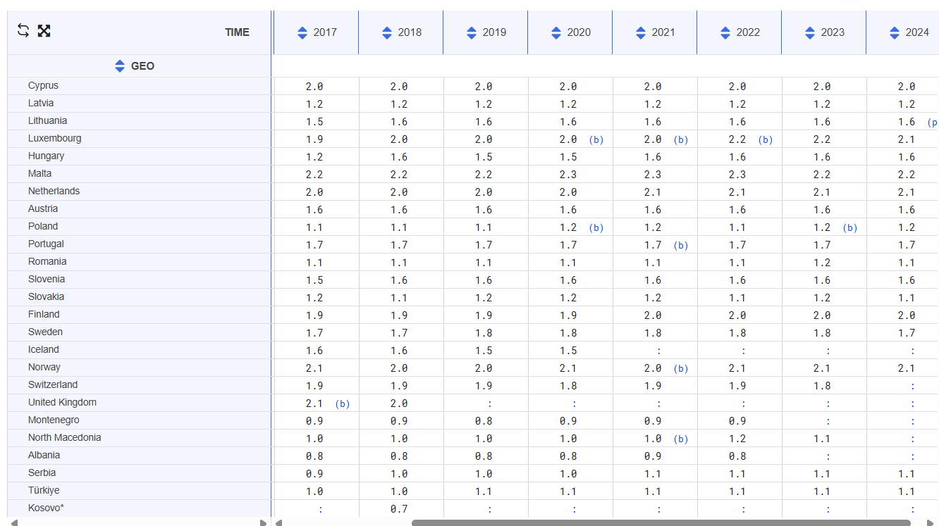 Кипар, Малта, Холандија, Норвешка се земји каде просечно едно лице има по 2 или нешто повеќе од две соби на располагање. Таков резултат имала и Британија. Финска последниве години е со просек од 2 соби по лице, а во Шведска просекот е 1.8 или 1.7 соби. Во Швајцарија просекот се движи од 1.8 до 1.9 соби по лице.