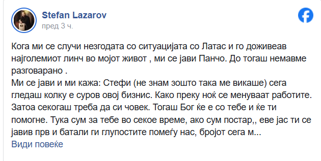 „Кога ми се случи незгодата со ситуацијата со Латас и го доживеав најголемиот линч во мојот живот, ми се јави Панчо. До тогаш немавме разговарано. Ми се јави и ми кажа: Стефи (не знам зошто така ме викаше) сега гледаш колку е суров овој бизнис. Како преку ноќ се менуваат работите. Затоа секогаш треба да си човек. Тогаш Бог ќе е со тебе и ќе ти помогне. Тука сум за тебе во секое време, ако сум постар, еве јас ти се јавив прв и батали ги глупостите помеѓу нас, бројот сега ми го имаш, јави се за што и да ти треба. После неколку години во битката со канцерот на Зоки донираа и пари како ДНК. Претходното лето на настап на Слаткар во Охрид се вртам и го гледам Панчо... Му викам брату бе, што стоиш на страна дојди со нас. Ми вика не не, нема потреба да ме гледаат, дојдов од срце. Да поддржам наш артист. Вакви ситуации има многу. Колку и да сме имале несогласувања, ми покажа дека сè било шоубизнис, позадината ти беше секогаш ГОЛЕМА! Почивај во мир Панчо. За жал денес умре и последната надеж за една од најголемите музички групи во Македонија. Почивај во мир ДНК!“, пишува Лазаров.