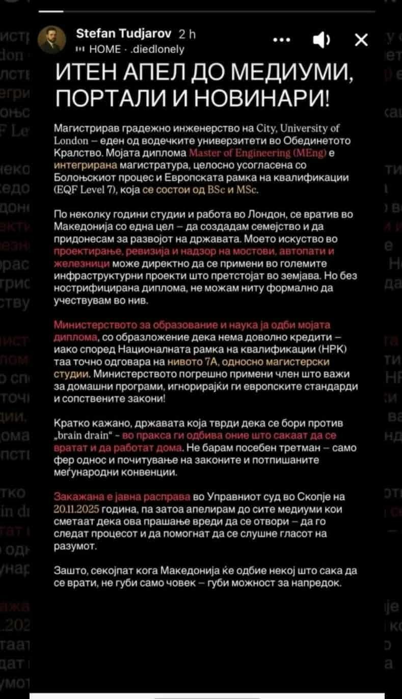 Овој млад човек преку објава на социјалните мрежи се пожали дека Министерството за образование и наука ја одбило неговата диплома, со образложение дека немал доволно кредити. Инаку, Туџаров студирал и работел во Лондон. Нагласува дека секогаш кога Македонија ќе одбие човек кој сака да се врати, одбива можност.