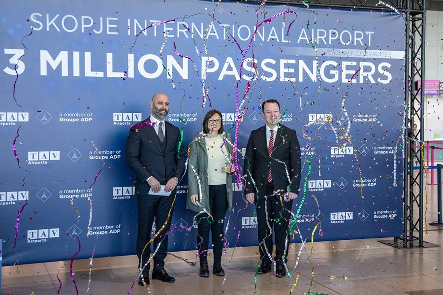 Генералниот директор на ТАВ Македонија, Неџат Курт и вицепремиерот и министер за транспорт, Александар Николоски ја изненадија 3 милионититата патничка додека се пријавуваше на летот Скопје - Бари, информирајќи ја дека токму таа го одбележува значајниот момент за скопскиот аеродром и дека ќе добие награда.
