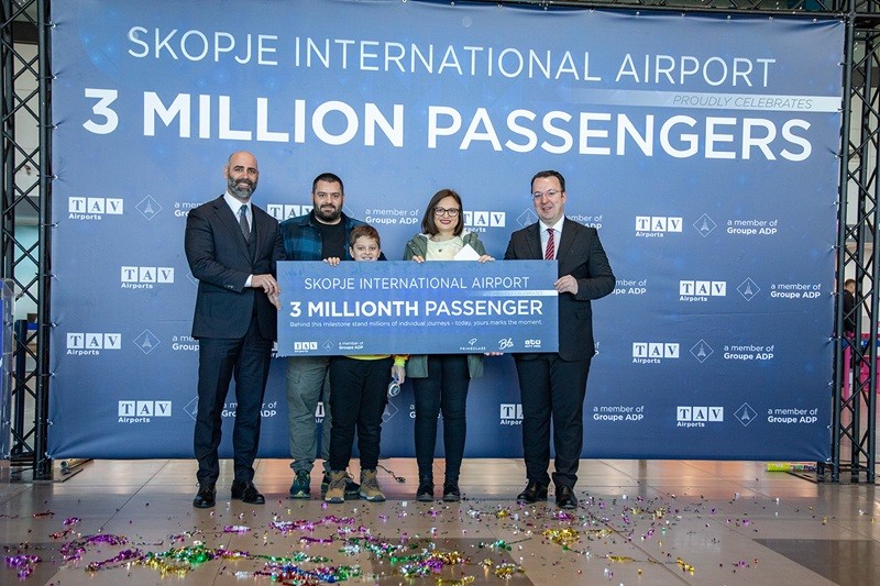 TАВ Македонија, подружница на ТАВ Аеродроми и членка на АДП Групацијата, денес го прослави 3 милионитиот патник во една година на Меѓународниот аеродром Скопје.