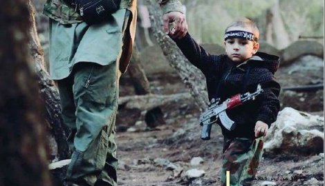 На фотографијата која е направена од позиција на фронтот јасно се гледа дете од четири години, облечено во црн блузон, со пушка преку рамото и со лента на борците на Исламската држава како оди на чело на сирискиот фронт.